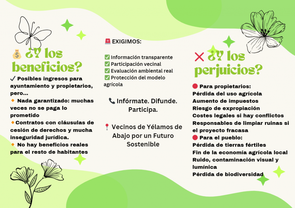 Un grupo de personas, que no tienen al dinero como primera prioridad, se han preocupado por investigar que hay detrás de estas propuestas y lo que están viviendo en pueblos similares. El panorama es desolador: presiones a los que no quieren alquilar, expropiaciones, impagos del alquiler, e instalaciones abandonadas que ya no permiten que el campo sea ni bonito ni cultivable.