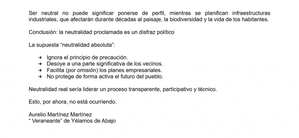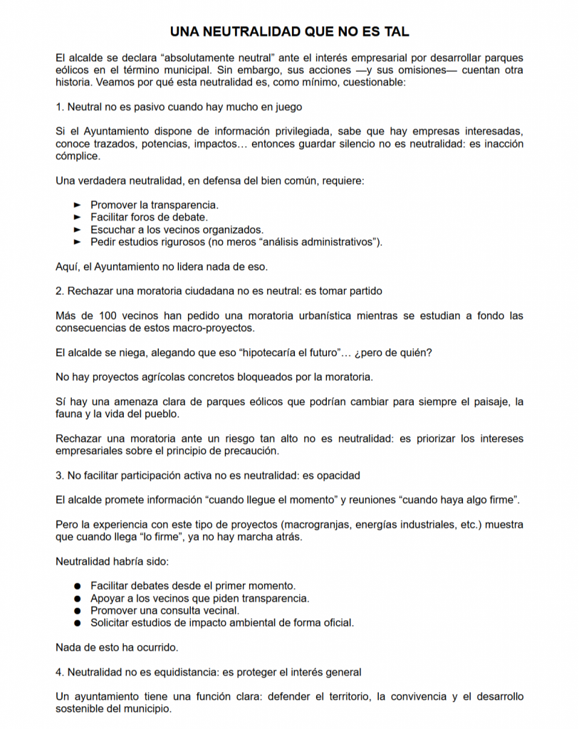 Solo hubo unas declaraciones en respuesta a artículos de prensa. En ellas, el alcalde declaró su “neutralidad” ante la instalación de molinos. Una neutralidad difícil de comprender para buena parte del pueblo, y que muchos interpretaron como una falta de implicación en un asunto que afecta directamente al presente y al futuro del territorio. Siempre respaldado por un grupo, una especie de guardia pretoriana difícil de entender, mientras la mayoría calla. Y ese silencio colectivo duele quizá más que las decisiones equivocadas.